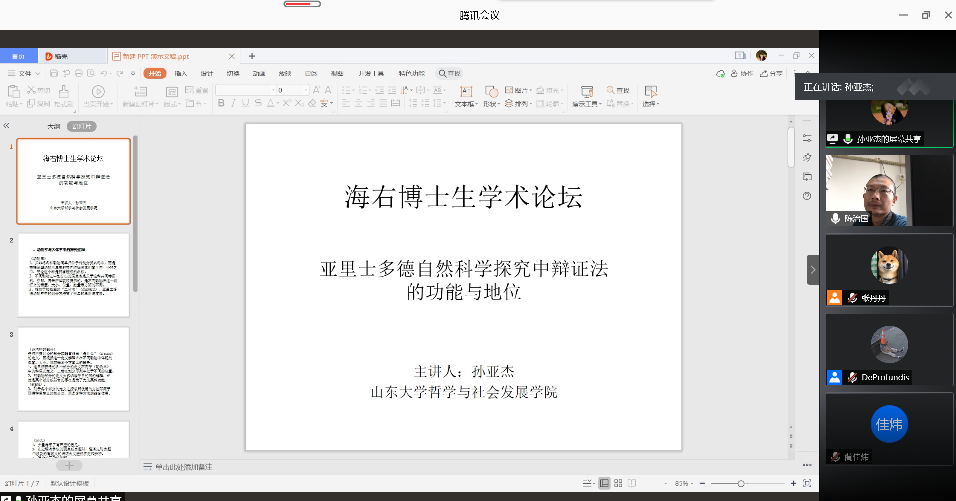 孙亚杰博士从四部分介绍了她对亚里士多德自然科学探究中辩证法的功能与地位,第一部分,是她对动物学、天体学的主体部分的论述,之后通过厘析《后分析篇》中作为一般科学探究之主要任务或目标的种属式原因和事物属性的原因,考察《后分析篇》与《论题篇》中获求两种原因的一般方式和进路,最后,进一步明确辩证法在动物学与天体学中更为全面的应用。