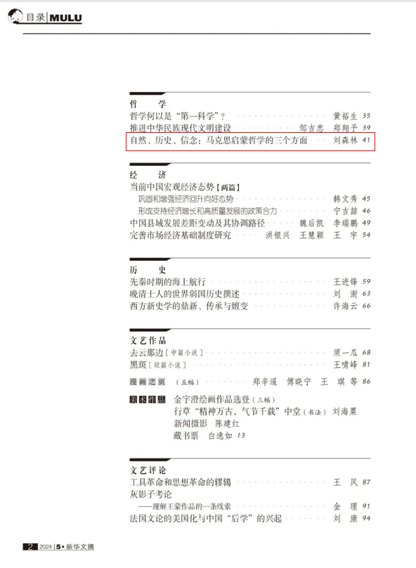 刘森林教授的研究成果“自然、历史、信念:马克思启蒙哲学的三个方面”(原载《北京师范大学学报》2023年第5期),被《新华文摘》2024年第5期全文转载。
