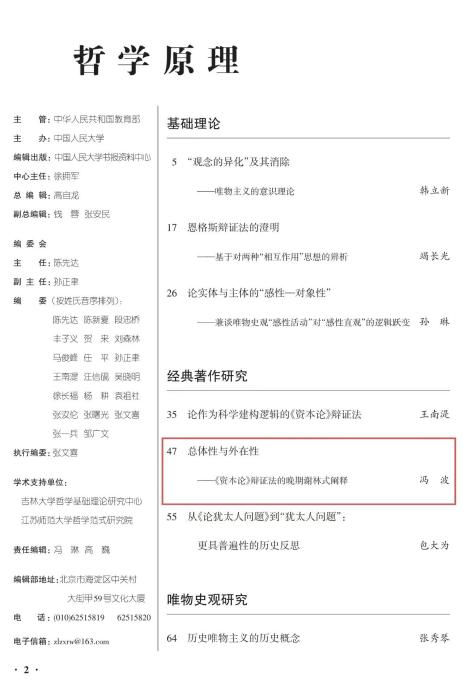 冯波教授的学术论文《总体性与外在性——《资本论》辩证法的晚期谢林式阐释》(原载《马克思主义与现实》2024年第1期),被人大复印报刊资料《哲学原理》2024年第5期全文转载。