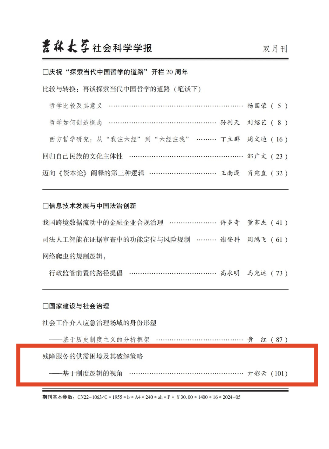 亓彩云副教授在《吉林大学社会科学学报》2024年第3期上发表了题为《残障服务的供需困境及其破解策略——基于制度逻辑的视角》的高质量论文。