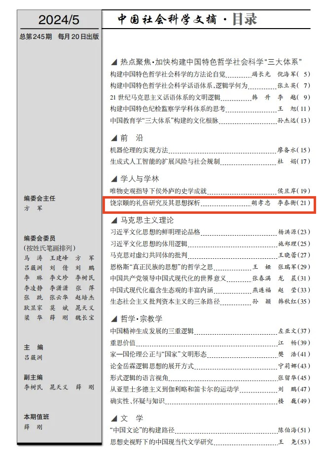 胡孝忠副教授与复旦大学博士研究生李泰衡共同在CSSCI来源期刊《民俗研究》2024年2期发表的论文《饶宗颐的礼俗研究及其思想探析》被《中国社会科学文摘》2024年第5期转载、推介。