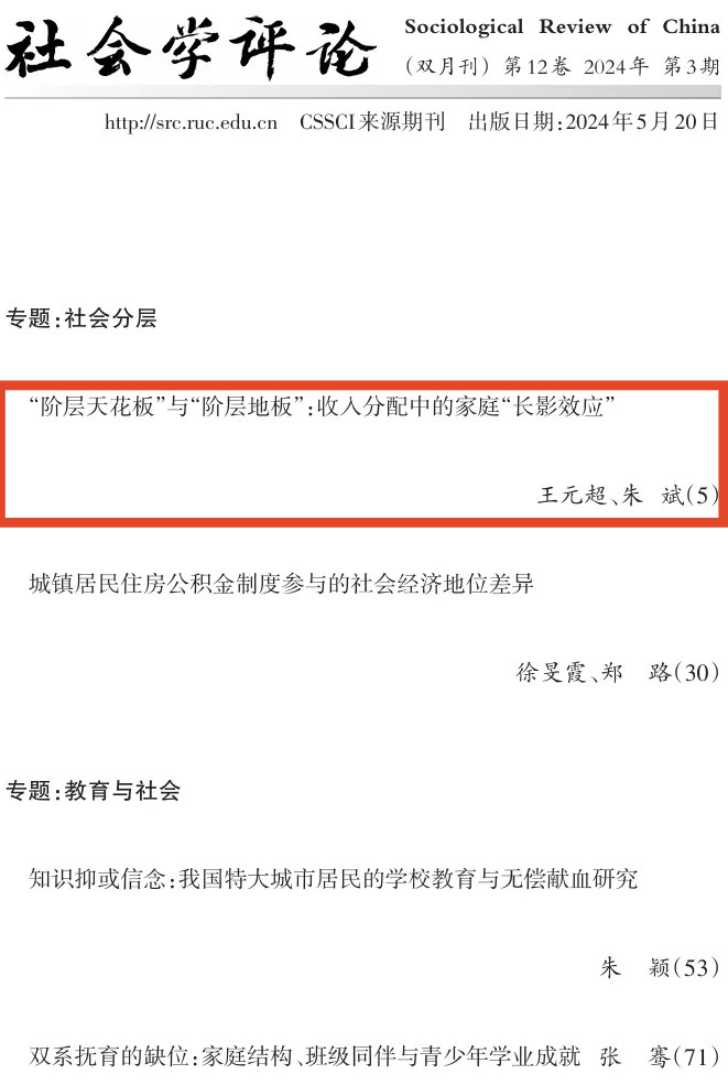 青年教师王元超、中国人民大学社会学院朱斌副教授共同在《社会学评论》2024年第3期上发表了题为《“阶层天花板”与“阶层地板”:收入分配中的家庭“长影效应”》的高质量论文。