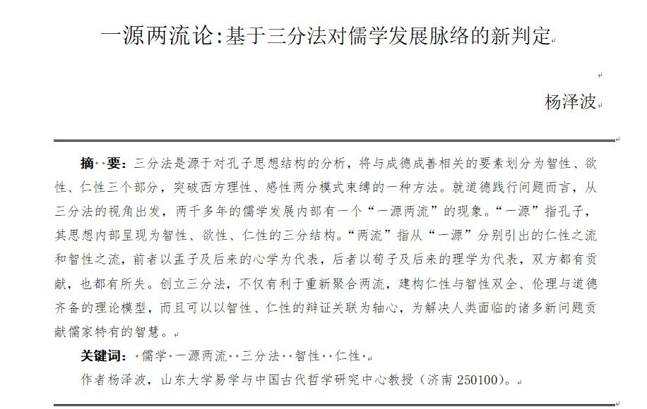 易学与中国古代哲学研究中心杨泽波教授撰写的《一源两流论:基于三分法对儒学发展脉络的新判定》一文在《中国社会科学》2024年第5期发表,全文16000字。