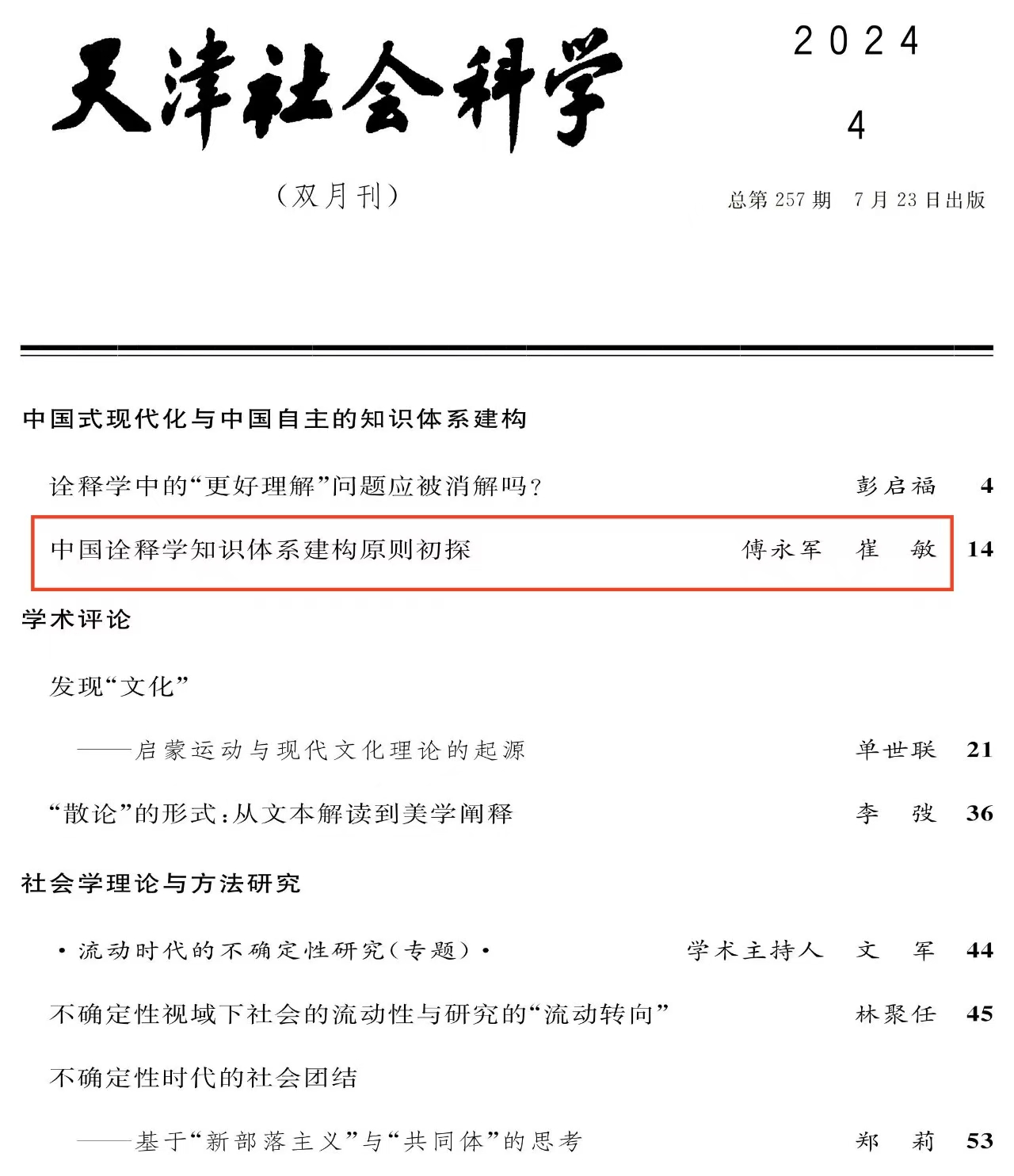 傅永军教授与其博士研究生崔敏共同在《天津社会科学》 2024年第4期上发表了题为《中国诠释学知识体系建构原则初探》的高质量论文。