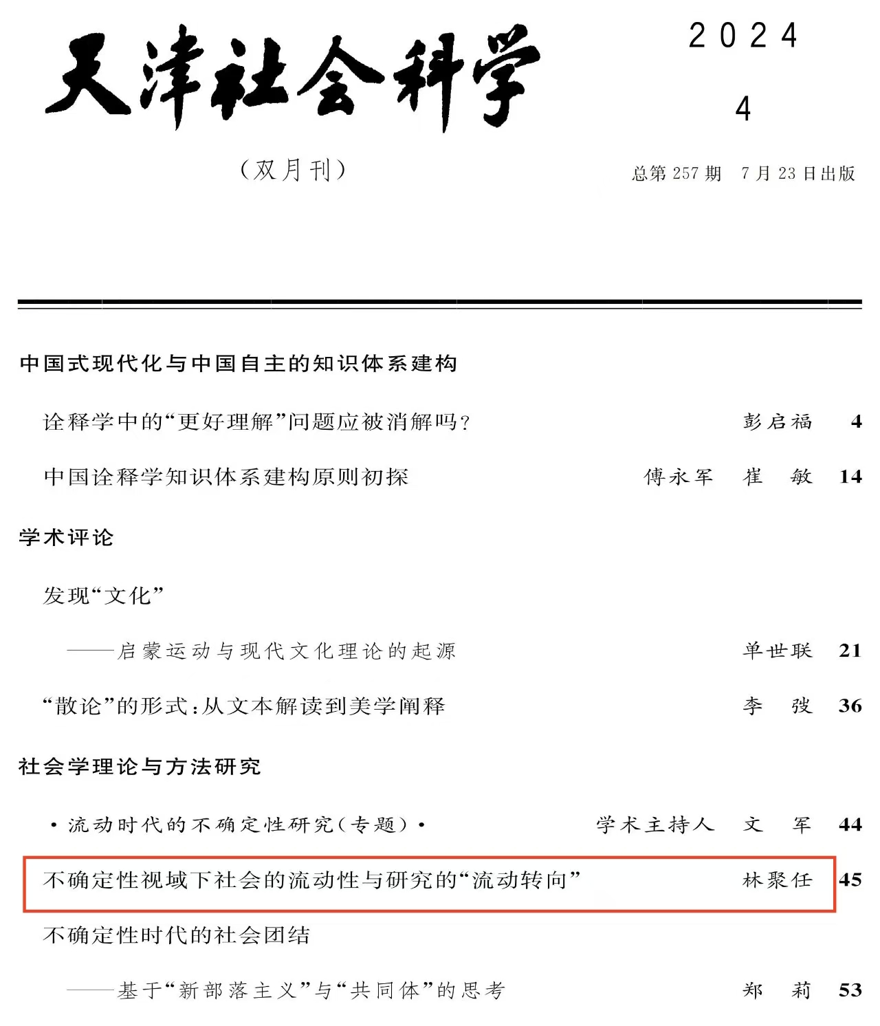 林聚任教授在《天津社会科学》 2024年第4期上发表了题为《不确定性视域下社会的流动性与研究的“流动转向”》的高质量论文。