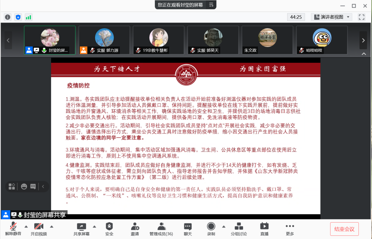 团委高度重视学生实践安全,依托实践队队长、团支书、班长等主要人员,利用宣讲、通知、推文等各类形式,面向参与社会实践的全体同学宣传安全工作要求,切实增强学生安全意识。本次会议围绕“安全”这一主题,反复强调了同学们在暑期社会实践中安全工作的重要性,并介绍了许多安全工作中的误区与陷阱,为参与暑期社会实践的全体同学打了一剂预防针、强心剂,为推动暑期社会实践安全有序进行起到了积极的引导作用。