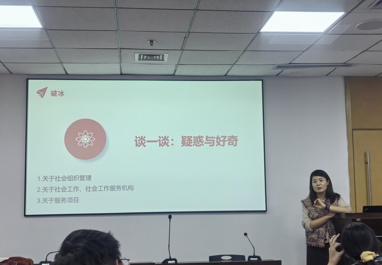 首先,张海丽从社会工作的职业生涯故事谈起,分享自身从大学学习到社会实践,从认识社工到热爱社工,从岗位社工到运营机构的发展历程,希望同学们在大学生活中积极探索自我,找到创新创业的起点。