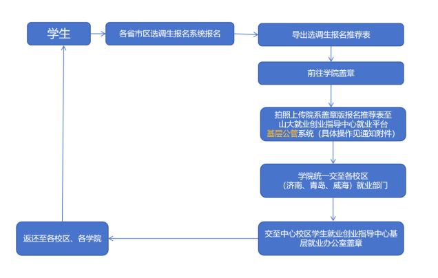 学生就业创业指导中心基层公管系统填写登记信息,并在附件位置上传院系盖章版《报名表》进行报名登记。我处不受理未在基层公管系统登记的《推荐表》。(系统操作请见附件)