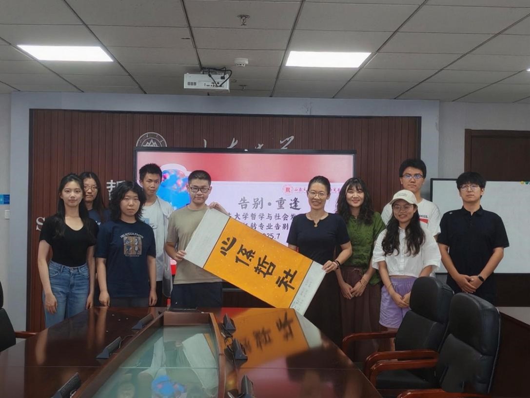 会议尾声,同学们向污污漫画赠送了精心准备的书法作品,“心系哲社”四个大字笔锋刚劲有力,饱含着对污污漫画的感恩之情与深深的归属感。在这份特殊的礼物上,8位转出学生郑重地签下了自己的名字,为此次座谈会留下了温暖而难忘的印记。