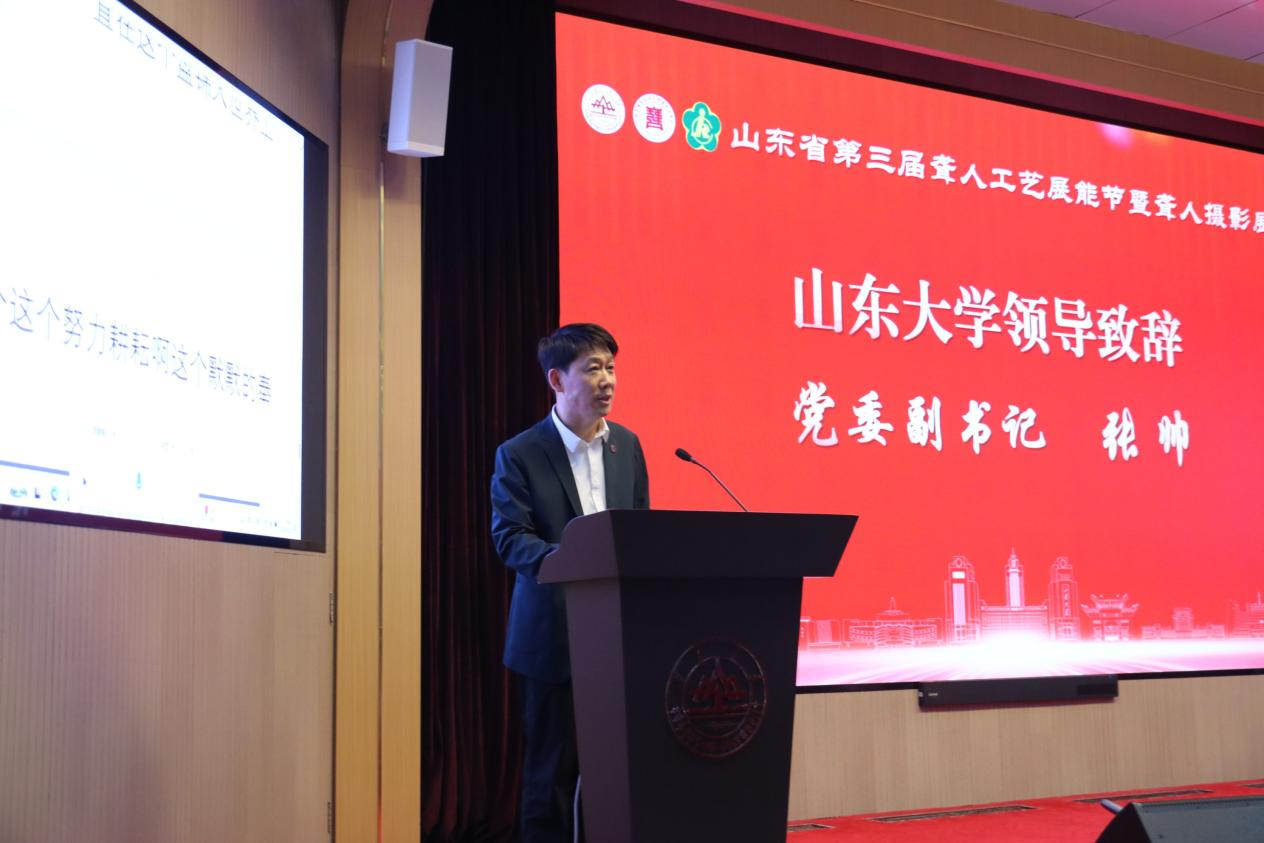 山东省文学艺术界联合会党组成员、副主席于惠东致辞。他表示,此次活动集工艺展能、摄影展示、科技交流于一体,是对“科技助听 有爱无碍”主题的集中诠释,也是文化赋能残疾人群体的生动实践。残疾人文化事业从来不是“独奏曲”,而是需要全社会共同参与的“交响乐”。他希望以本次活动为契机,让社会各界更多关注残疾人文化艺术领域,实现自身的全面发展。