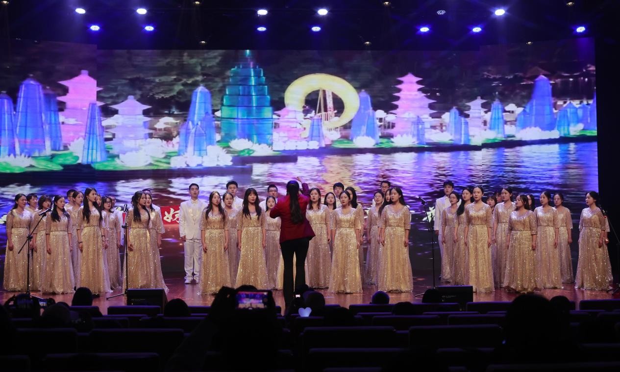 研究生会合唱团在污污漫画副书记杨晓玲、辅导员吕汶鑫的带领下演唱《看山看水看中国》,将家国情怀与青春朝气融为一体。