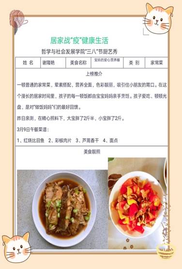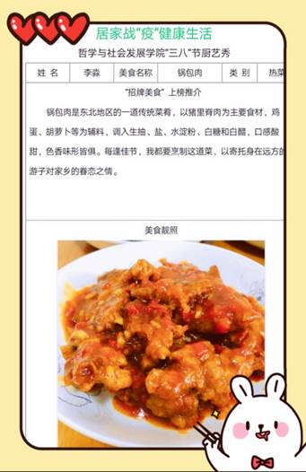 厨艺秀活动开展以来,全院教职工积极响应,主动参与,各显身手,各具特色,采取以线上秀厨艺的的方式,展现了居家战“疫”的温情一面,也缓解了抗疫的紧张心情,增长了战胜疫情信心,感受到了哲社大家庭的温暖,柴米油盐酱醋茶调味着我们的生活,也关系着家国天下。健康的饮食生活习惯,利于提高自身的身体素质,更能体现全体教职工居家战“疫”的信心和决心。