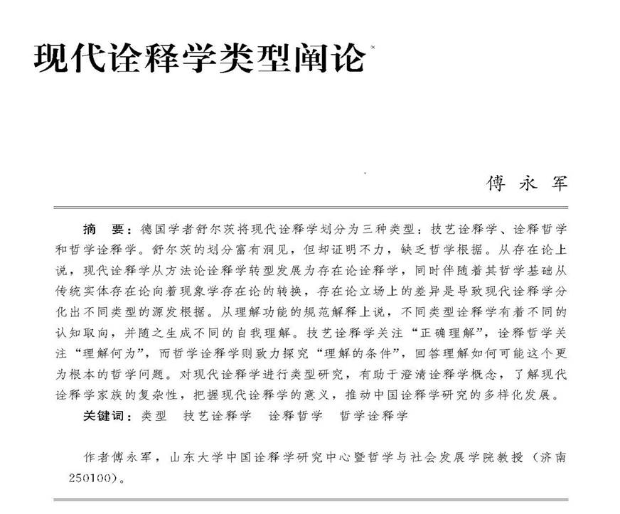 傅永军教授所撰写的《现代诠释学类型阐论》一文在《中国社会科学》2020年第3期发表,全文约20000字。