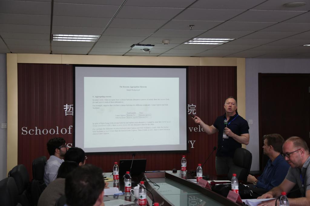 会议报告内容中西交融也是本次会议的一个重要特色。将古典中国哲学中的伦理学与认识论智慧用英美分析哲学的风格阐述出来,具有高度启发性。南京师范大学陈真教授运用西方哲学中的分析方法讨论阳明心学中的道德理论,论证了王阳明的道德理论不是主观的,而是先验的且普遍为真的。南京大学胡星铭教授运用分析哲学方法分析了庄子的一个重要论证:要成为智者就必须悬置价值判断。