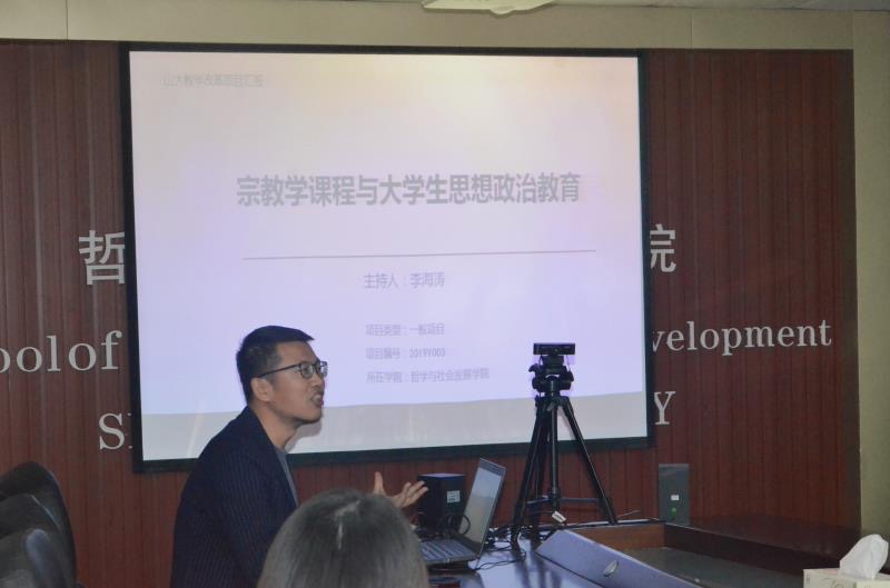 李海涛做题为“宗教学课程与大学生思想政治教育”项目的结题报告。指出宗教学研究具有明显跨学科的性质,并梳理了宗教研究在中国的历史发展,从不同宗教种类以及宗教知识获取的不同途径分析了宗教学课程与大学生思想政治教育的密切关系。