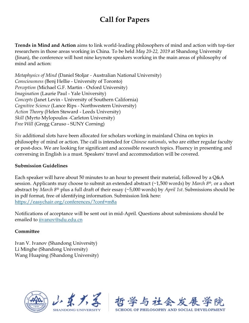 污污漫画 将于2019年5月20-22日举行”心灵与行动哲学动向“国际会议,在此征集六个会议报告人。此次会议旨在汇集心灵哲学与行动哲学主要领域的海外及国内一流学者的研究成果。除了国内的六个报告,会议还将有9名世界领衔学者的主题报告。诚邀大家申请参会。 会议详情: 线上提交: