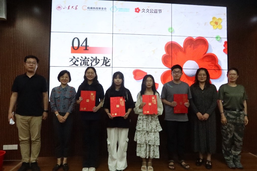 党委副书记马燕、翁祥栋,副教授张洪英及校友代表张皓宇先生,向参与筹备为爱呐“罕”系列活动的学生组织、学生公益团队颁发了荣誉证书。同时,北京病痛挑战公益基金会和济南瓷娃娃罕见病关爱中心在第40个教师节到来之际,与同学们一起为现场老师送上了最诚挚的祝福。