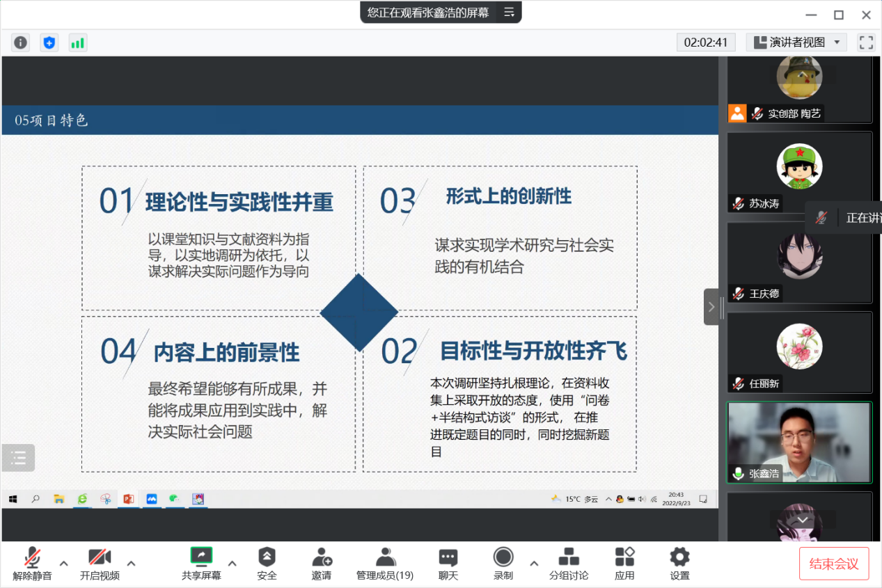 2021-2022学年暑期社会实践结项答辩会通过腾讯会议线上举行,社会工作系教授任丽新老师、社会学系副教授苏冰涛老师、辅导员封莹老师、研究生代表张循铖、王乐担任本次答辩会评委并进行结项指导,各院级立项团队答辩代表参会。
