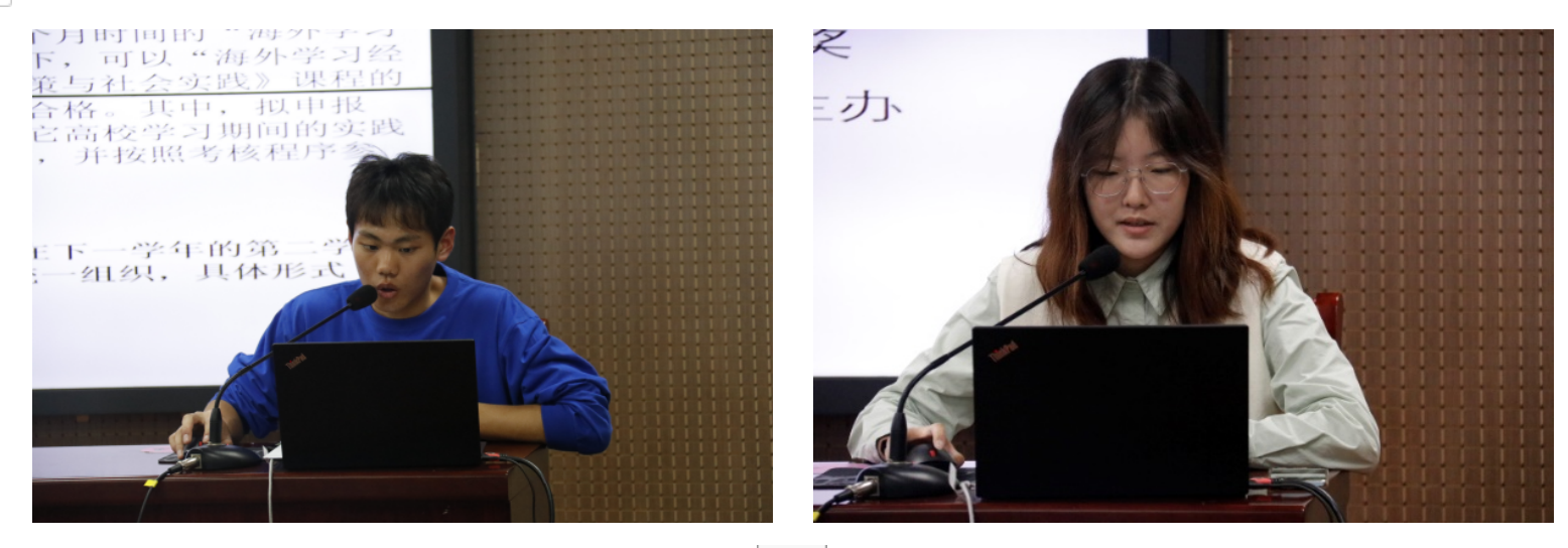 实践创新部负责人王庆德从社会实践活动的界定、内容和形式、组织实施、考核办法以及团队调研的过程与评价标准五个方面向同学们具体介绍了社会实践活动的相关事宜;负责人陶艺围绕“挑战杯”创业计划竞赛、“挑战杯”课外学术科技作品竞赛及“互联网+”创新创业大赛三大代表性赛事,针对时间安排、参赛条件及参赛组别等分别进行详细介绍,让同学们对社会实践活动和创新创业赛事有更为细致和深入的了解。