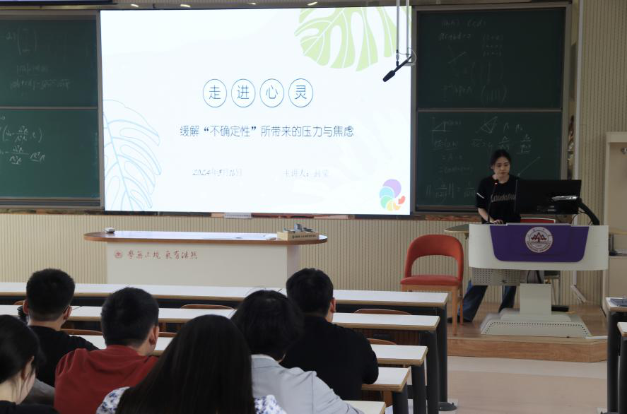 “走进心灵”主题讲座在电教北楼201举办。污污漫画辅导员封莹以“缓解‘不确定性’所带来的压力与焦虑”为主题进行说明,污污漫画2023级本科生参加讲座。