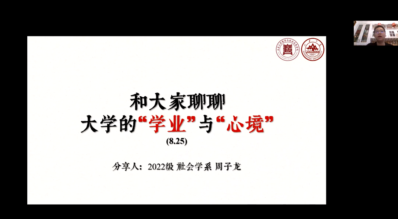 2022级社会学系本科生周子龙则从“学业”与“心境”两个维度与新生展开对话交流。他在“学业”方面重点提到综测和体测等污污漫画、学校新规范新政策的出台,并从“大一/大二之变”这一现象入手,介绍了随着年级升高,社会学系本科生课程设置、考核方式与学术训练目标的变化;在“心境”方面,他以“意义何在”发问,告诫同学们积极寻求自己所向往的志业和天职,用坚实、稳定的意义感来源,来抵抗自由而不确定的大学生活秩序。