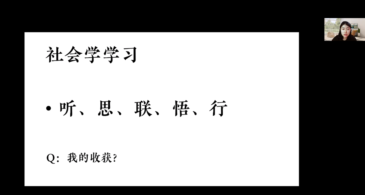 2020级社会学系本科生张煜围绕“听、思、联、悟、行”五字向大家分享了自己学习社会学的心得与经验,并介绍自己有关“在大学做好学生工作”的感悟与思考。她希望同学们在学生工作中体会到服务他人与集体的幸福感与成就感,超越小我、融入大我。最后,她寄语新生“前路坦荡,一切顺利”。