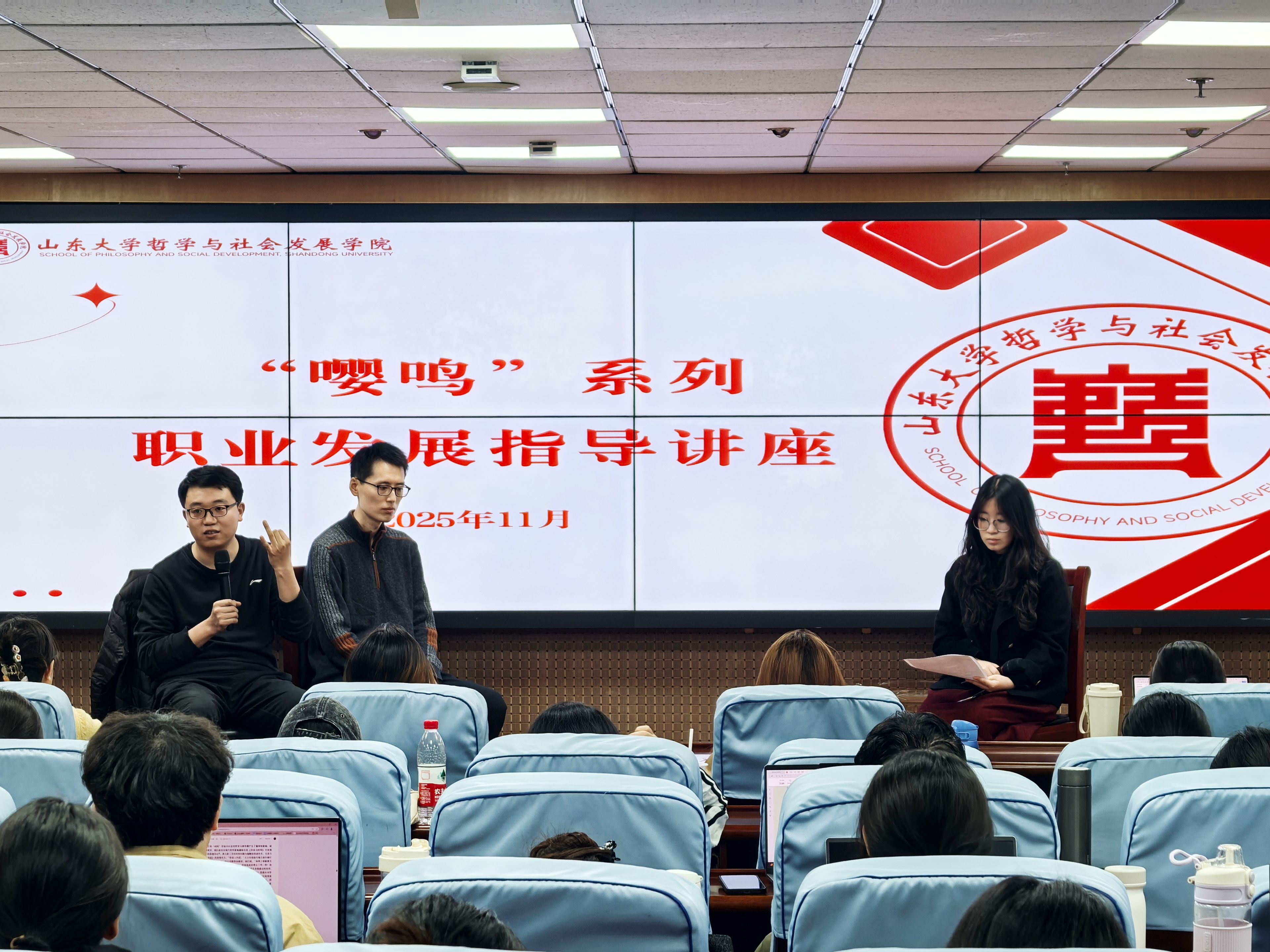 于知新楼A1521召开“嘤鸣”系列职业发展指导讲座,由商务局干部郑郁寒博士与拥有多层级机关工作经验的杨方成同志担任主讲嘉宾,24级哲学专业本科生李心怡主持。
