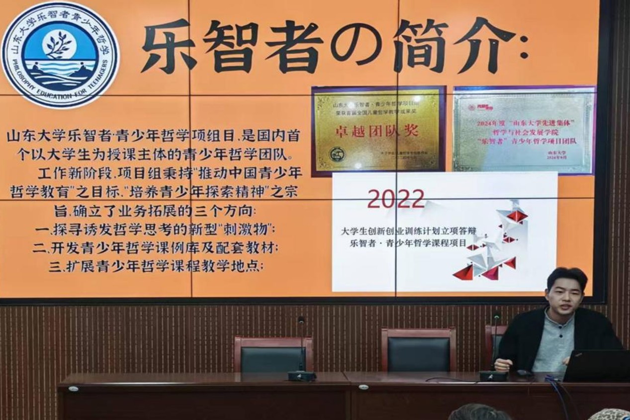 第三支进行分享的队伍是山大哲社的乐智者团队成员曹鹤松。他首先对乐智者团队进行了简要介绍,随后分别从前期立项、实践宣传、结项答辩等流程出发,提供自己的独有见解,并且强调了分工时应当遵循“术业有专攻”、对资源的合理利用与团队协作的重要意义,并呼吁同学们能够积极参与对自己和社会有意义的社会实践活动,在丰富自身,实现自我成长的同时助推社会发展。