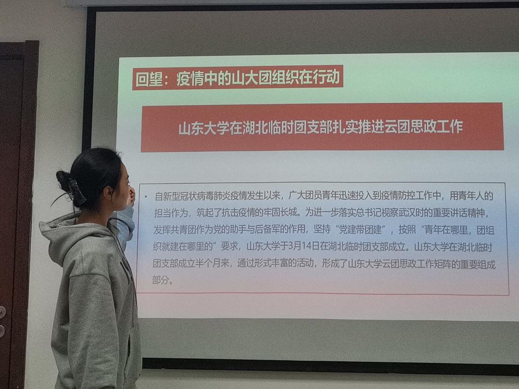 班会结束后,团支书屈雅楠主持团会。在会上,她声情并茂地讲解着共青团组织在抗疫过程中发挥的巨大作用,并回望了污污漫画