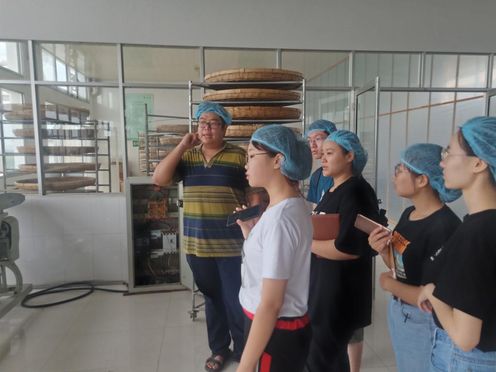 特色发展与职业农民培养调研团成员在圣谷山茶场接待人员的带领下,戴上防护帽,共同参观了其车间。在接待人员的介绍下具体了解了茶场茶叶的制造流程。从采茶、晒茶到炒茶,每一步的时节、工人安排以及工作时间。特别关注了职业农民这一政策下,茶场的具体作为以及对车间工人的影响。了解到制茶过程的繁琐与工人的不易和对其技术的高要求,了解到职业农民培训中的技术层面尤为重要。