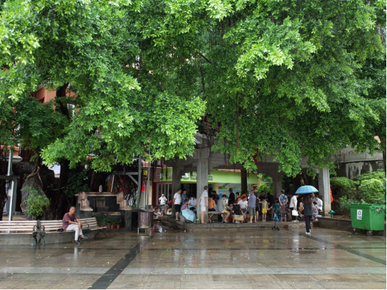 天公不作美,今日大雨,根据昨天的经验,下沙村文化广场中的亭子里常有人打牌,成员们决定将此处定为第一个目标点。即使是下雨,牌友们热情不减,亭子里依然满员。人们把雨伞撑在亭边,防止雨水被风吹进来。亭中有一圈圈打牌的人,每一圈外面又站了有一圈看牌的人,我们为了融入环境,就近选择了一圈加入看牌的行列,借此机会和边上一位同样在看牌的大爷聊天。经过交谈团队成员得知,大爷住在周边小区,并不是下沙村本地人,祖籍浙江,82年部队转业来到深圳,平时没事把来看牌当做打发时间的娱乐活动,自己不打。团队成员发现在亭子中打牌的人似乎大部分都不是下沙本地人。