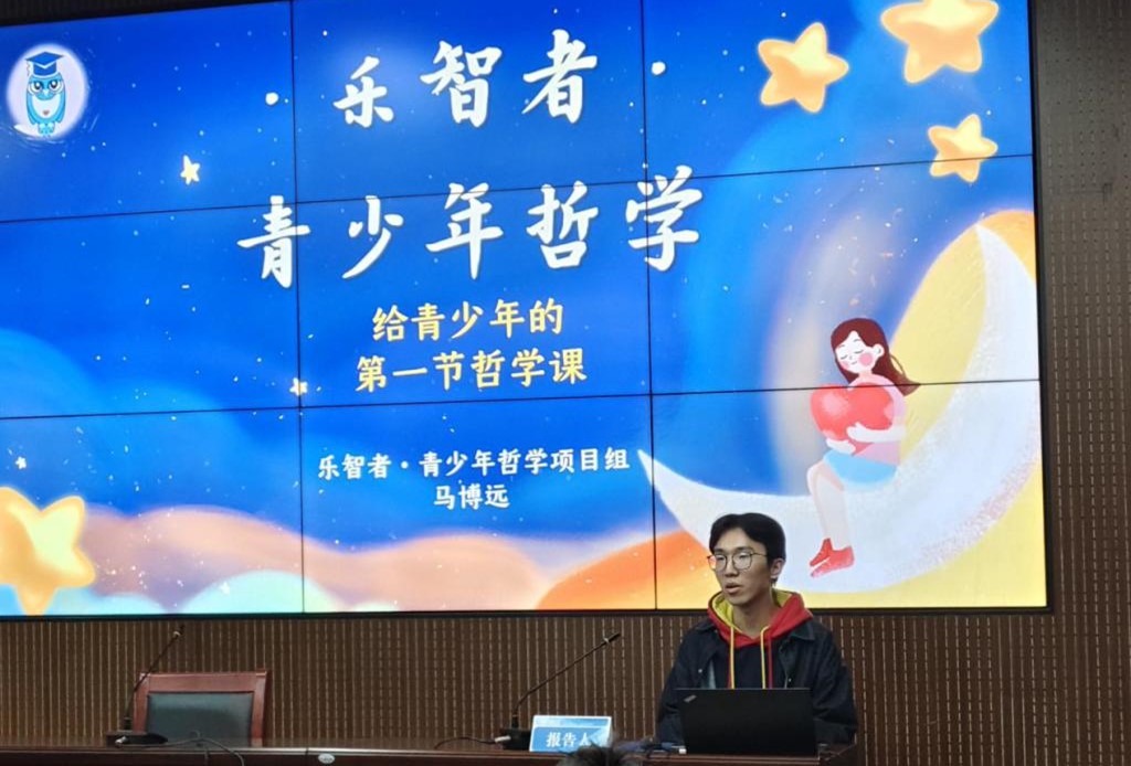 乐智者·青少年哲学项目组负责人马博远从“项目背景”、“项目设计”和“项目成果”等多个角度论证“乐智者”青少年哲学课项目的创新性、可行性及推广价值。在思辨的项目论证里,同学们逐渐认识到如何确立和完善一个项目,例如,如何从专业出发找寻问题与需求、拥有项目雏形后如何进行项目设计、具备项目规划后如何落地实践与成果产出。