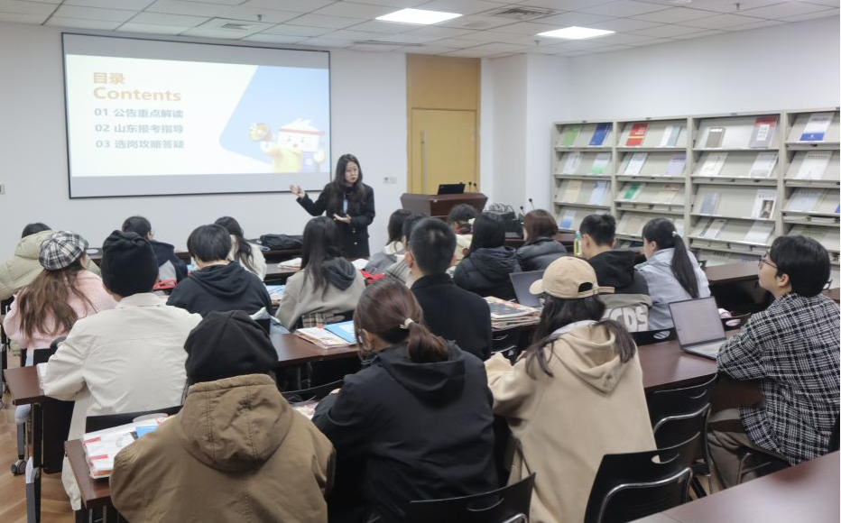 讲座中,孙睿琦立足国考、省考的最新招考情况,对考情政策进行了全面细致的解读。她结合具体案例介绍了最新的招考公告和报考注意事项,为同学们提供了精准、有效的备考建议。随后,她详细分析了山东省公考的特点,为同学们提供了清晰的备考方向。最后,孙睿琦从人岗匹配、职业规划和生活规划三个方面传授了实用的选岗技巧。