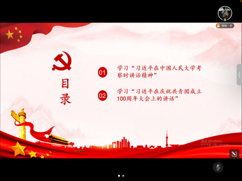 学术硕士第二党支部开展主题党日活动,学习贯彻习近平总书记在中国人民大学考察时的重要讲话精神和在庆祝中国共青团成立100周年大会上的重要讲话精神。支部预备党员鉴伟伟同志主持活动并领学。