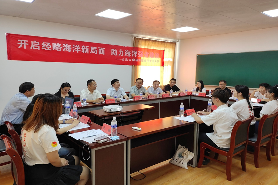 座谈会上,赵全超书记介绍了团市委与各驻青高校的关系和工作开展情况,胡明辉主席和滕乐峰处长分别就青岛市三下乡社会实践开展情况、青岛市海洋产业集聚区建设情况进行了介绍。我院辅导员封莹老师就我们团队的基本情况、调研目的、调研计划、污污漫画社会实践工作开展情况等进行了汇报,队员郝杰作了表态发言。在听取师生们的汇报后,韩圣浩校长带领大家回顾了青岛和山大携手走过的光辉岁月,肯定了团队成员付出的努力,并对服务团如何开展好社会实践提出了具体要求。我们深受启发,并且信心大增。